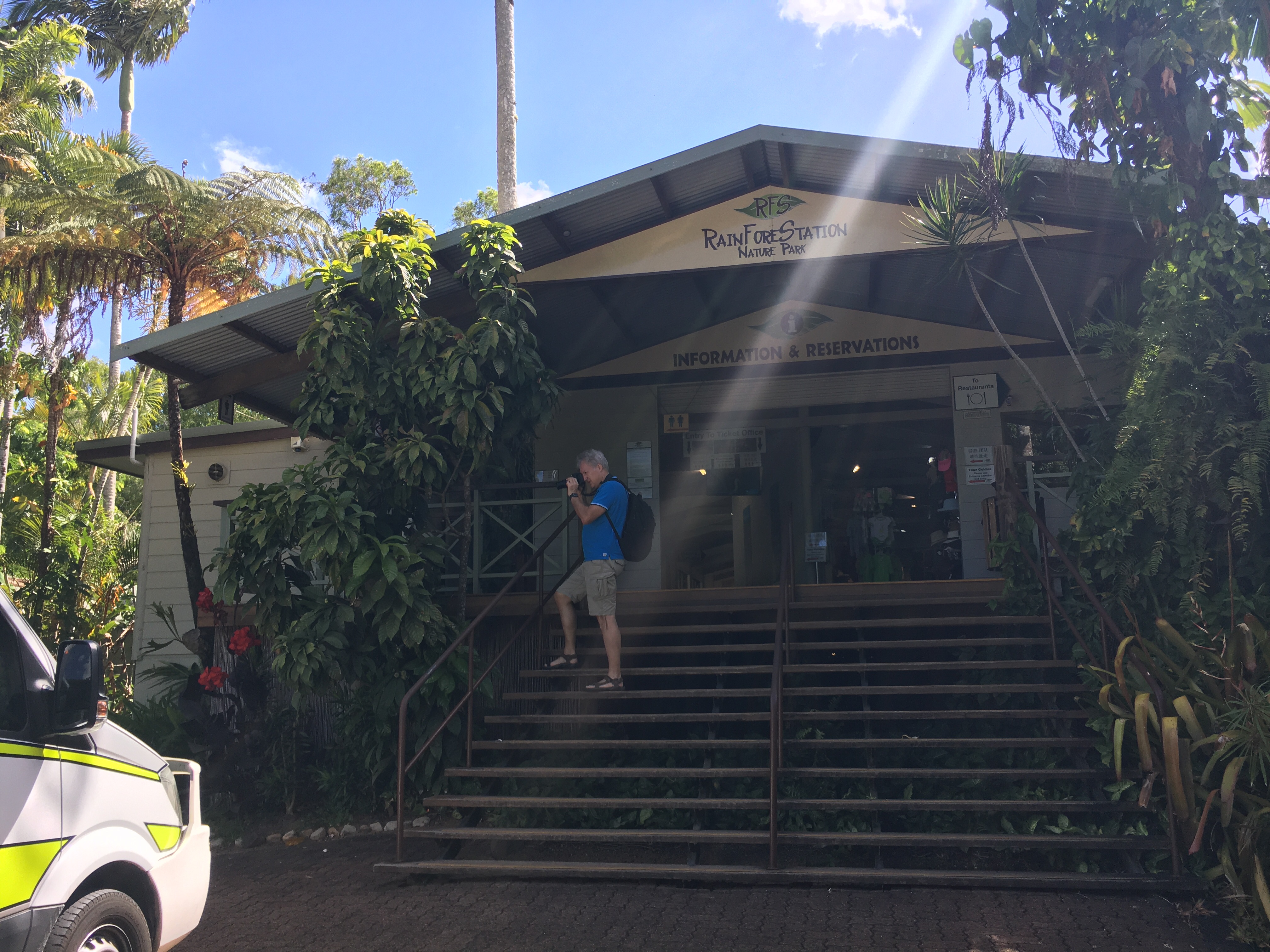Für den nächsten Tag hatten wir noch in Darwin einen klassischen Touristentrip nach Kuranda gebucht, für den wir um 8.15 Uhr am Hotel abgeholt werden sollten. Wenn man solche Onlinebuchungen macht ist es immer spannend, ob das dann auch klappt. Aber der Bus kommt und es geht pünktlich los. Kuranda liegt ein paar Kilometer im Hinterland von Cairns, mitten im Regenwald. Das erste Ziel ist die Rainforestation.